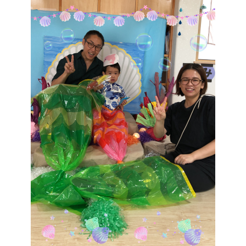 珊瑚に囲まれて人魚になりきったり、大きなクジラに乗ったり、子供たちの作品の大きな壁面の前などで記念撮影を楽しんでもらいました📷✨