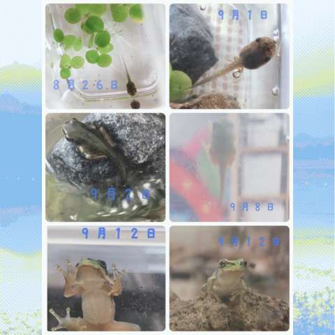 後ろ足が出た日には「おっ!」と声が出て、前足が生えた時には「もうすぐカエルだね🐸」と皆で喜び合いました。