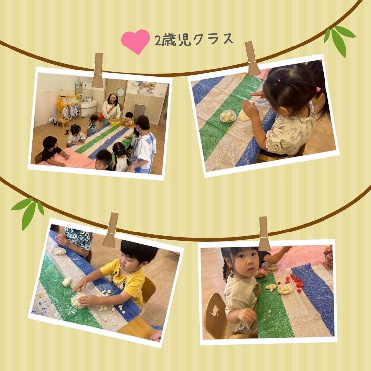 2歳児は白い粘土と食紅を加えた赤い粘土も使ってみました。