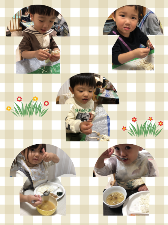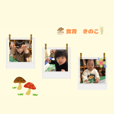 きのこの特徴でもある傘の形をじっくり見たり、匂いを嗅いだり、くっついているきのこを割いたりしました。きのこを細かく割くのが面白くて夢中になる子もいました。