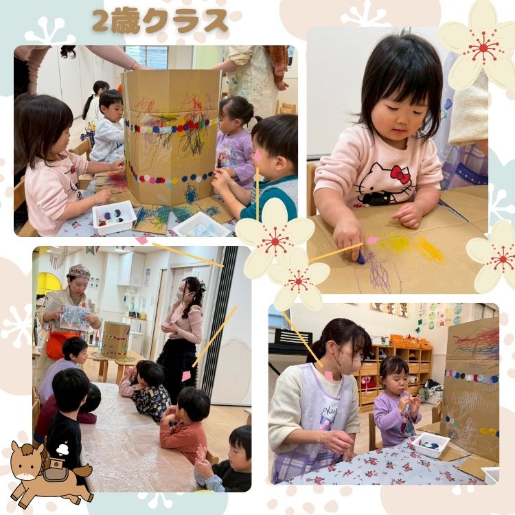 はじめに、台座となる大きな段ボールに、好きな色のクレヨンでお絵かきしました。