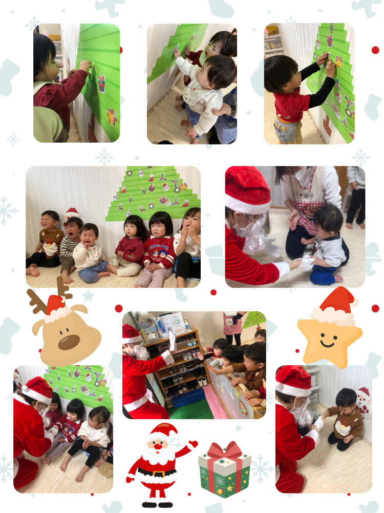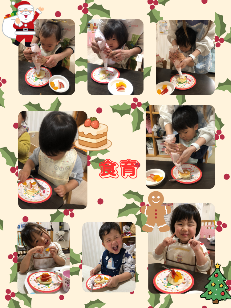 クリスマスの楽しい雰囲気を味わいながら、保育士と一緒にクリームを絞ったり、フルーツのトッピングを楽しむことができました🍓