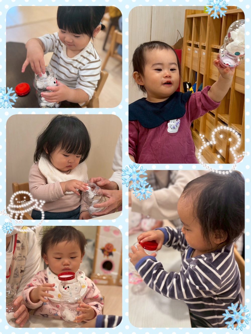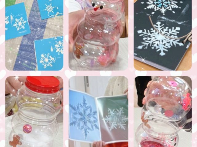 完成したボトルを振ってキラキラと雪が舞うような動きや、ビーズやスパンコールがカラカラと鳴る様子を楽しみました(●’◡’●)