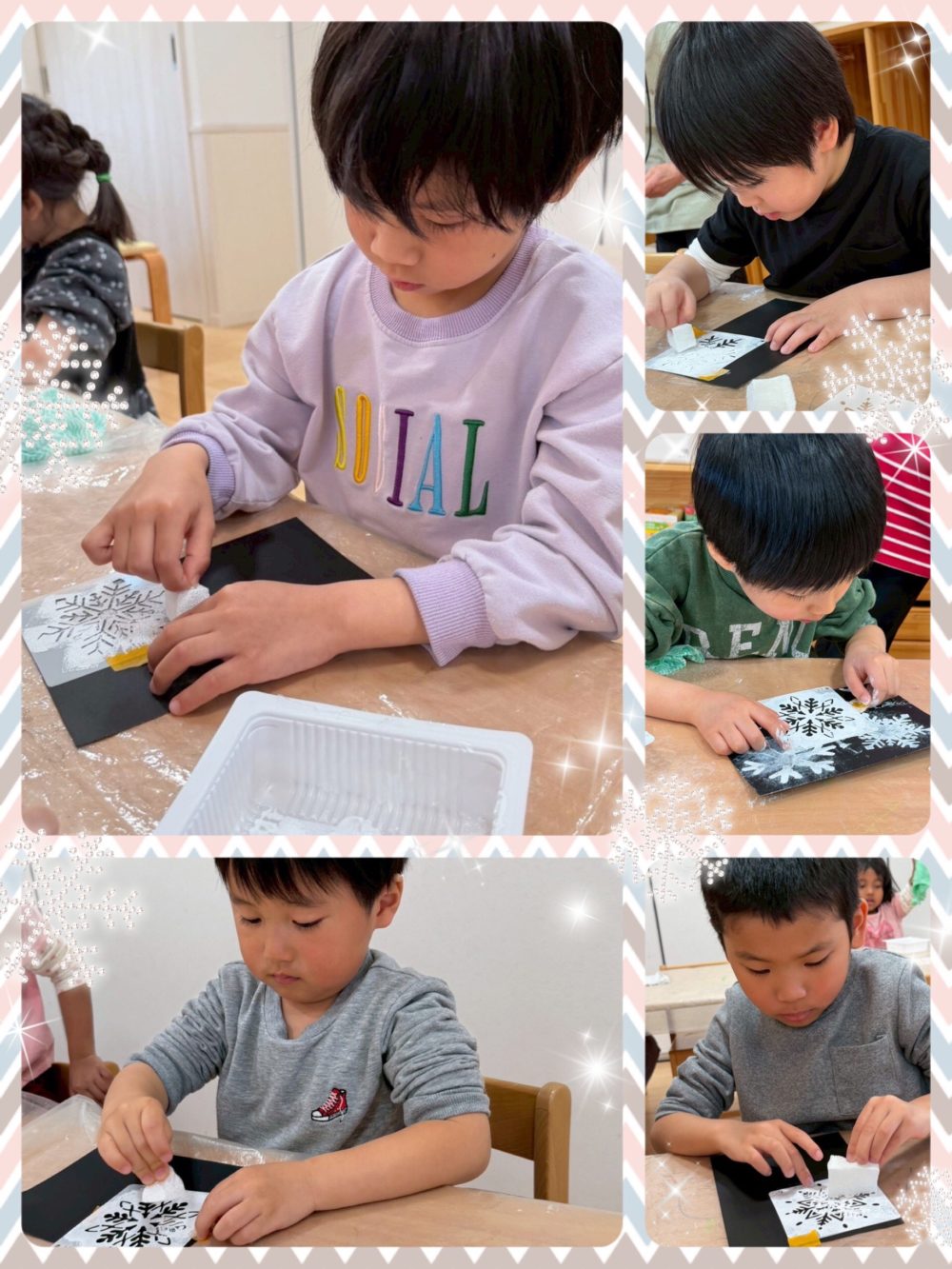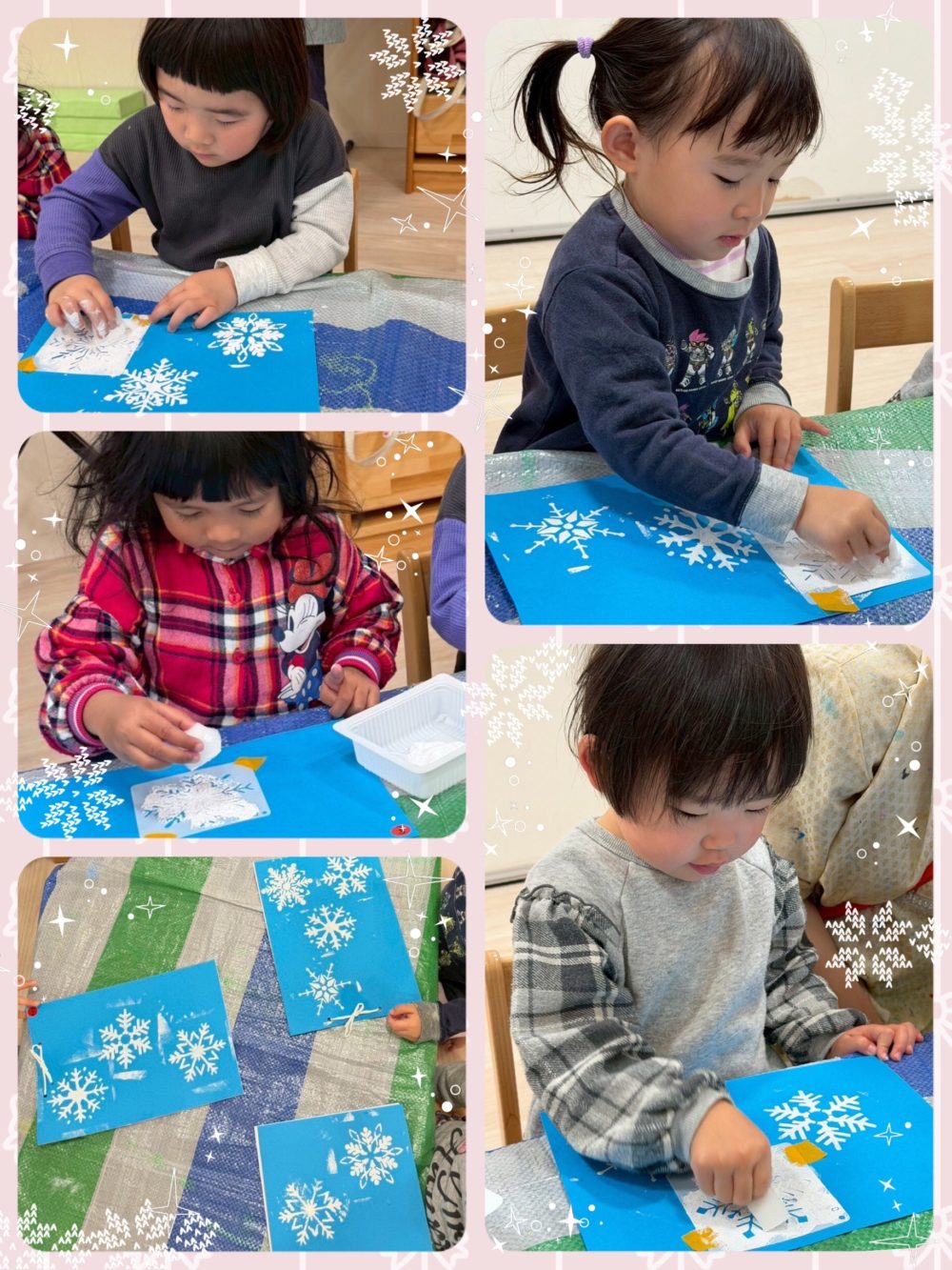 青色の画用紙の上に雪の結晶模様が切り抜かれたシートを置き、白色の絵具で色付けていきます!