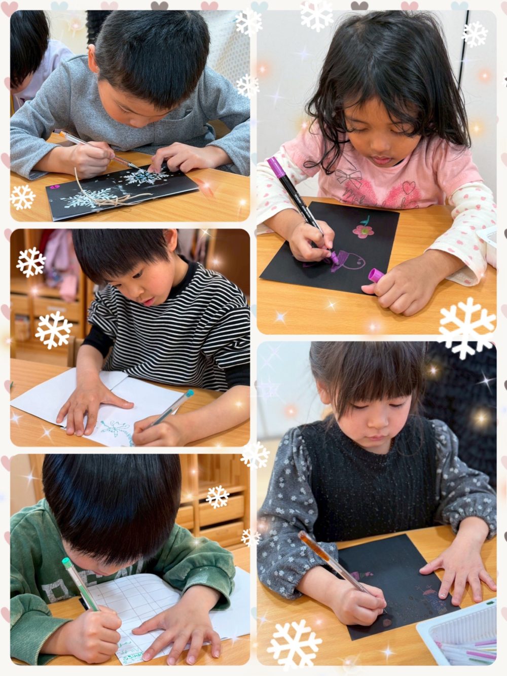 よく見ると雪の結晶のシートは模様が様々で、細かな切り抜きが施されたシートもあり、みんな端っこまでしっかり色付けができるよう真剣に取り組んでいました。