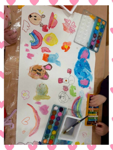 最初は大きな画用紙に練習!自分の好きな絵やハートをたくさん書いて、水性絵具を上から塗って、クレヨンが弾く瞬間を楽しみました🙌🤩