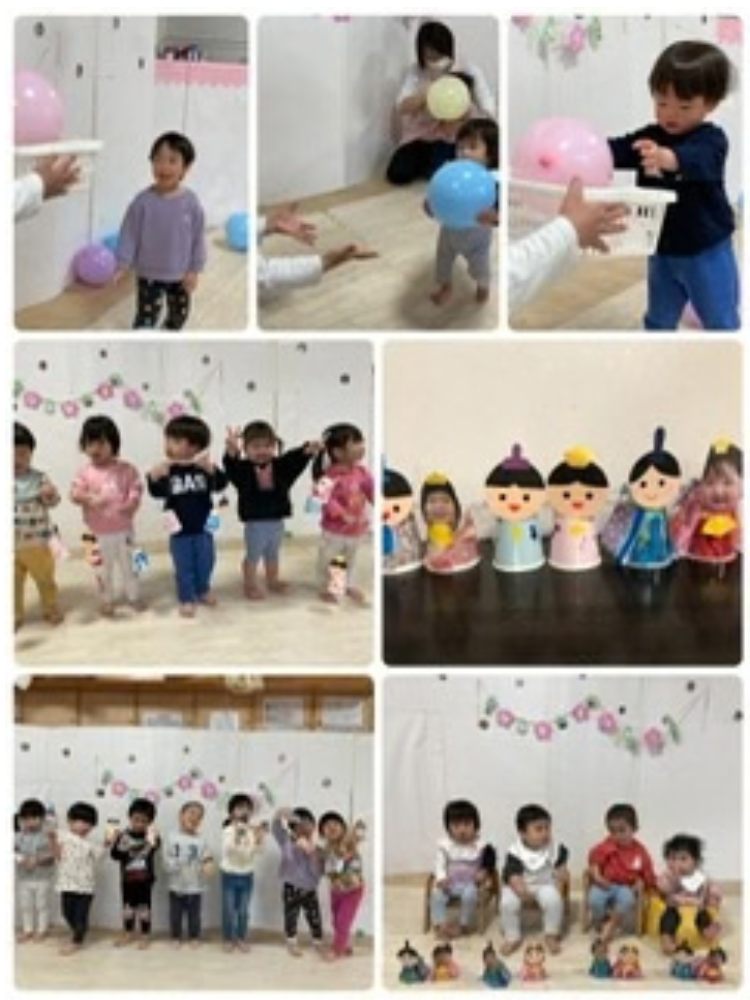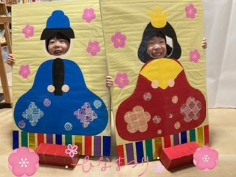 その後は各クラスに戻って、顔ハメパネルでお雛様になったり、ひなあられゲームをしたり、雛壇作りを楽しみました😊